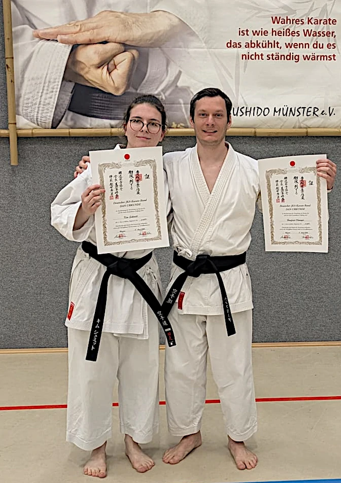 Unsere Mitglieder Hanfried Ohmayer und Km Schmidt haben in Münster erfolgreich die Prüfung zum ersten Dan absolviert. Wir gratulieren ganz herzlich und hoffen, dass der neue Gürtel ein weiterer Ansporn ist.